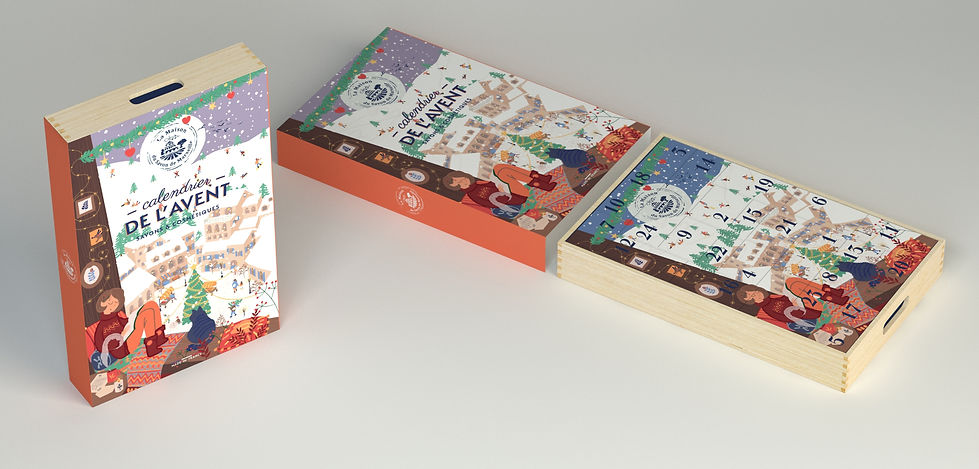 Graphiste et chargée de communication au sein de la maison mère, dans le Vaucluse, j'ai conçu et réalisé le calendrier de l'Avent 2022. Les produits star de l'événement commercial ; une édition limité de produits bien-être déclinée en trois parfum cocooning : orange-cannelle, baies de Noël et lait d'ânesse.